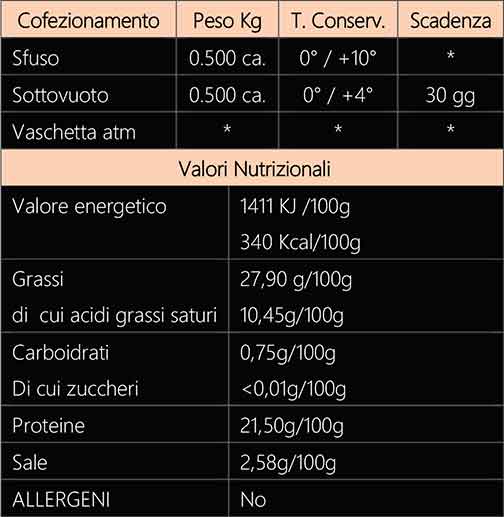 Insaccato di puro suino composto da un impasto di carne magra, grasso e cotenna di suino, con l’aggiunta di sale, pepe e altre spezie;ai fini dell’insacco sono utilizzati esclusivamente budelli naturali. Consistenza morbida e gelatinosa, colore rosato tendente al marrone chiaro, profumo delicato e finemente speziato secondo antica ricetta Toscana, gusto morbido, pastoso e delicato. Il prodotto si presenta in budello naturale in pezzature di peso medio 0,500 gr.