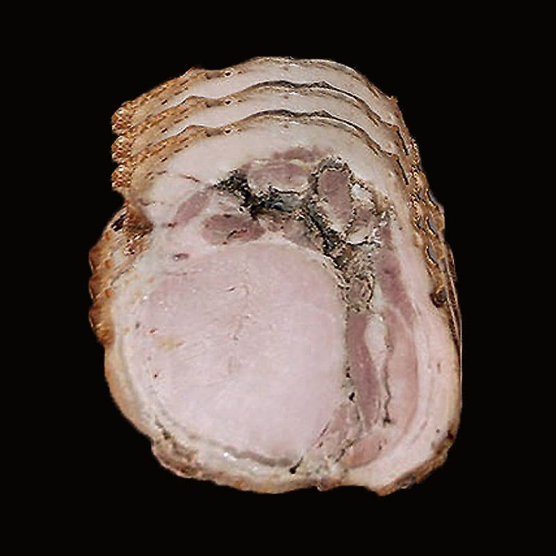 La porchetta affettata è un piatto tipico dell’Italia centrale e di poche regioni settentrionali. Consiste in un maiale intero, svuotato, disossato e condito, ideale per le merende in cantina, tipiche delle zone di produzione vinicola. Il suo consumo è tradizionalmente associato ai venditori ambulanti che si recano dov’è previsto un notevole afflusso di persone. (Wikipedia)