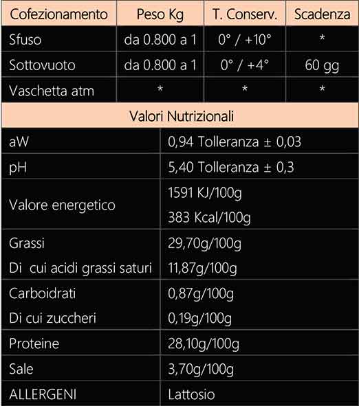 Salume di puro suino, ottenuto da macinatura ed insacco di carni selezionate magre e lardo, con aggiunta di parti di pancetta e gola; sottoposto a stagionatura minima di 45 gg ; ai fini dell’insacco sono impiegati esclusivamente budelli naturali di bovino (BUDELLO GENTILE). Consistenza compatta al taglio, profumo delicato e finemente speziato, gusto elegante dolce, moderatamente Sapido.